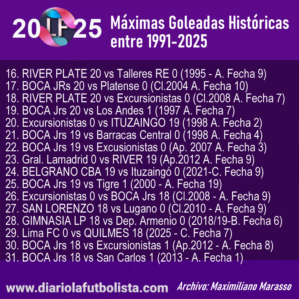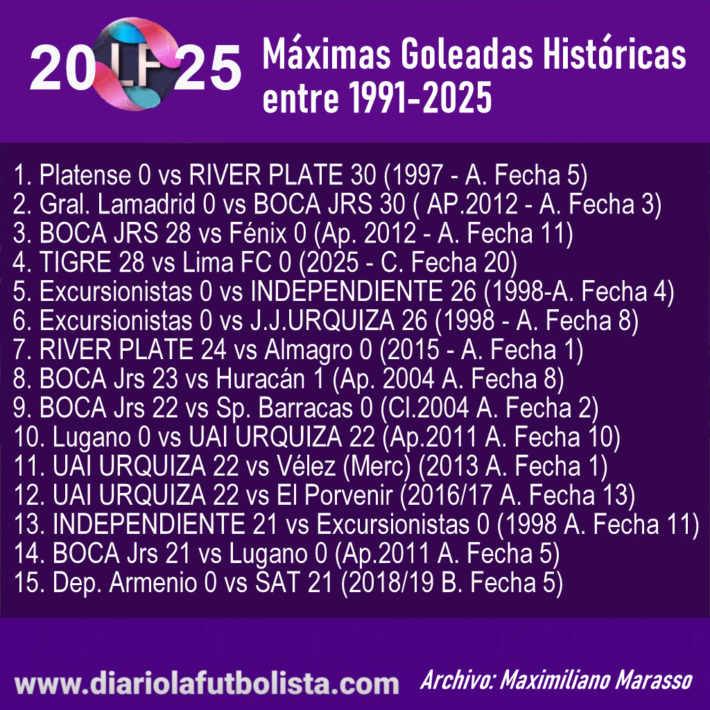 DLF confeccionó el listado de las máximas victorias abultadas teniendo en cuenta las tres categorías desde 1991 a la fecha. River y Boca, con un 30-0 lideran, seguidos por las Xeneizes y Tigre con un 28-0.
