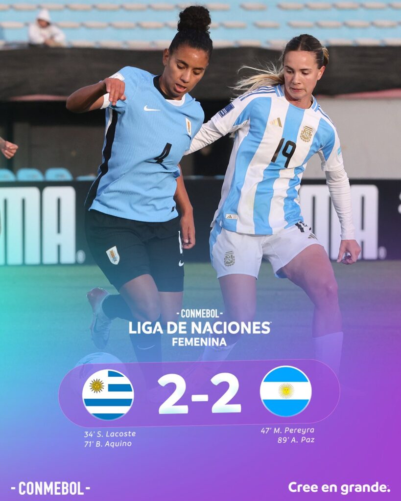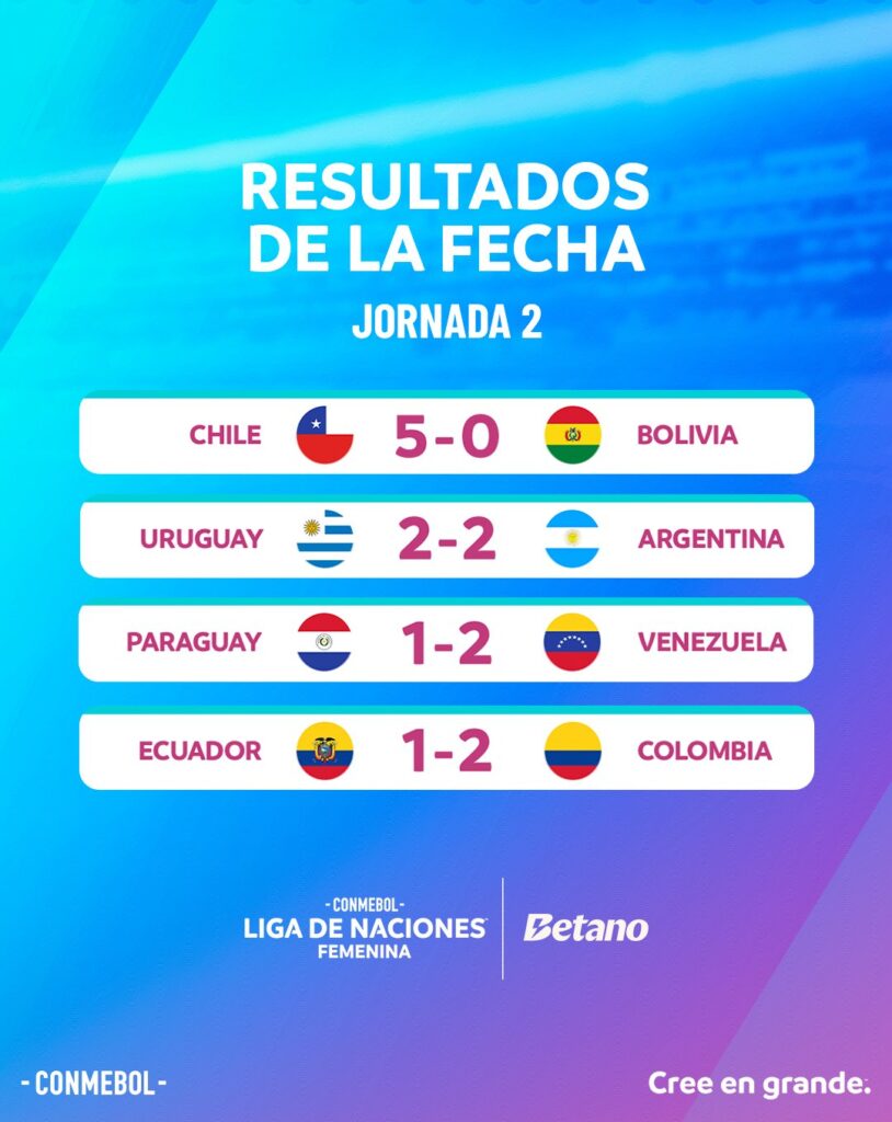 En Montevideo, Argentina igualó con Uruguay 2-2 (dos veces estuvo en desventaja) con un gol sobre el final; tantos de Maricel Pereyra y la juvenil Annika Paz. Colombia líder. Goleada de Chile. Triunfo de Venezuela.