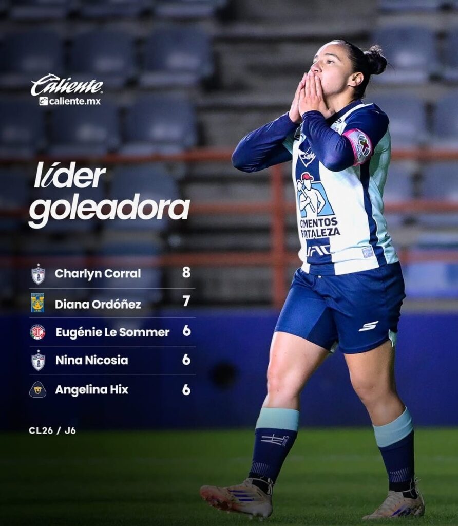 La argentina Nina Nicosia se coloca en la cuarta posición de la tabla de goleo individual con 6 anotaciones, su compañera de Pachuca, Charlyn Corral, es líder con 8 tantos en 6 fechas disputadas en el Torneo Clausura 2026. En el empate a 2-2 ante Tigres, Nina marcó el primer gol al minuto 35, Corral al 56.