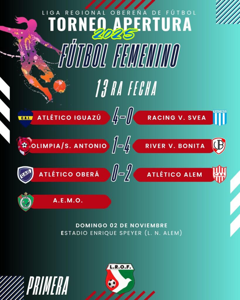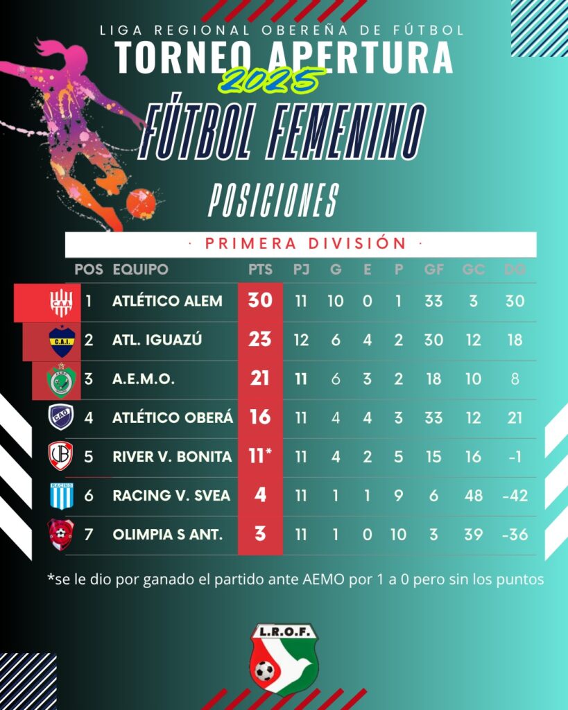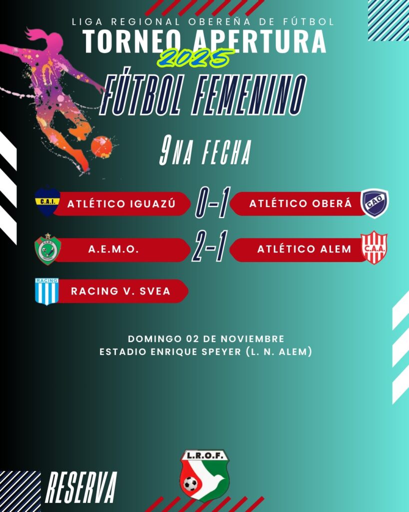 Atlético Alem superó a Atlético Oberá y aseguró el primer puesto en el Apertura, seguido por Atlético Iguazú que goleó. En Reserva, Racing puntero.