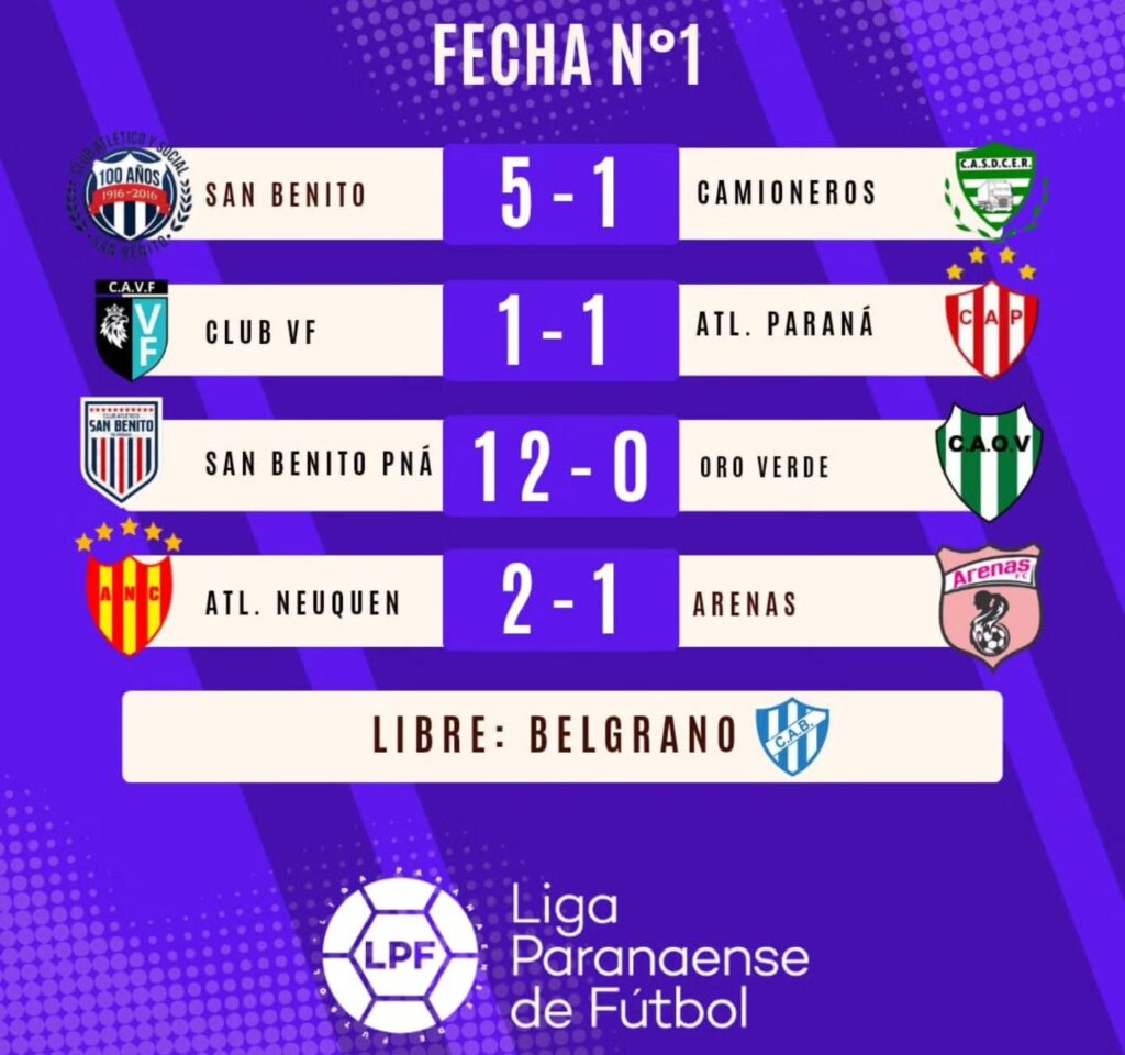 San Benito Paraná fue muy contundente: 12-0 a Oro Verde. También goleó San Benito 5-1 a Camioneros. Victoria de Atlético Neuquén a Arenas.